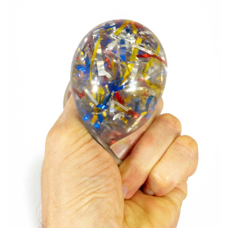 Gniotek w gumowej piłeczce do ściskania z kolorowymi tasiemkami to zabawka antystresowa z miękkiej gumy wypełnionej miękkimi kulkami. Warstwę wierzchnią stanowi gumowa przezroczysta piłeczka.